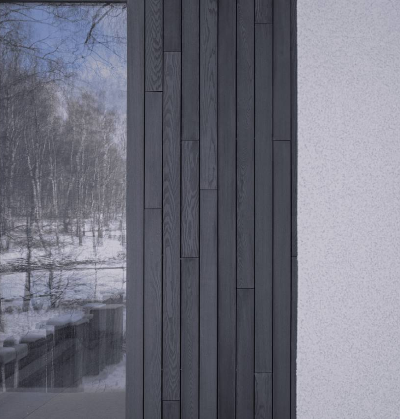 Материалом для облицовки фасада был выбран 100% натуральный массив Термоясеня, где каждая доска подчеркивает уникальную текстуру данной породы.