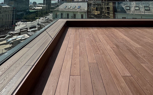 Термоясень — самый распространенный материал термообрабатываемой древесины. Он имеет богатый темно-шоколадный оттенок. Твердая структура позволяет использовать его как на фасаде, так и на террасе. Но самый главный плюс – его эстетические свойства.